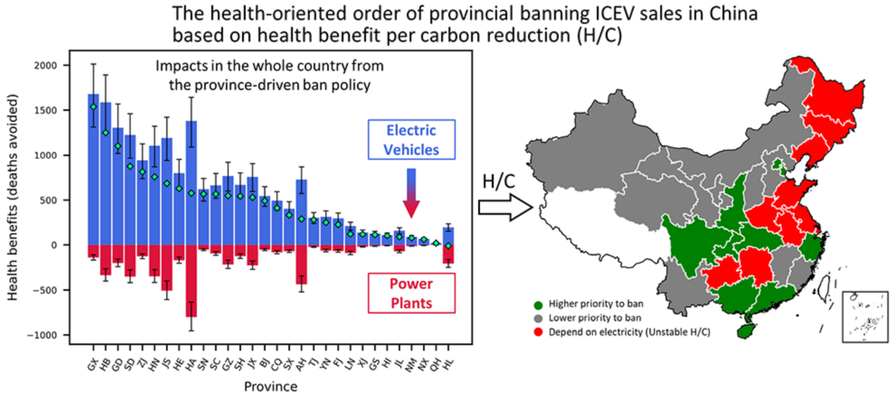 减少燃油车的使用是交通部门碳减排政策制定中的重要一环。估算不同省份禁售燃油车带来的碳减排和健康协同效益对制定“分步走”的策略、优化政策效率十分重要。为此,清华大学地学系蔡闻佳教授课题组围绕中国各省份禁售燃油私家车政策的优先序开展研究,探究了中国各省份禁售燃油车的碳减排及健康协同效益。成果以“Incorporating Health Cobenefits into Province-Driven Climate Policy: A Case of Banning New Internal Combustion Engine Vehicle Sales in China”为题,于1月6日在《环境科学与技术》(Environmental Science & Technology)在线发表。