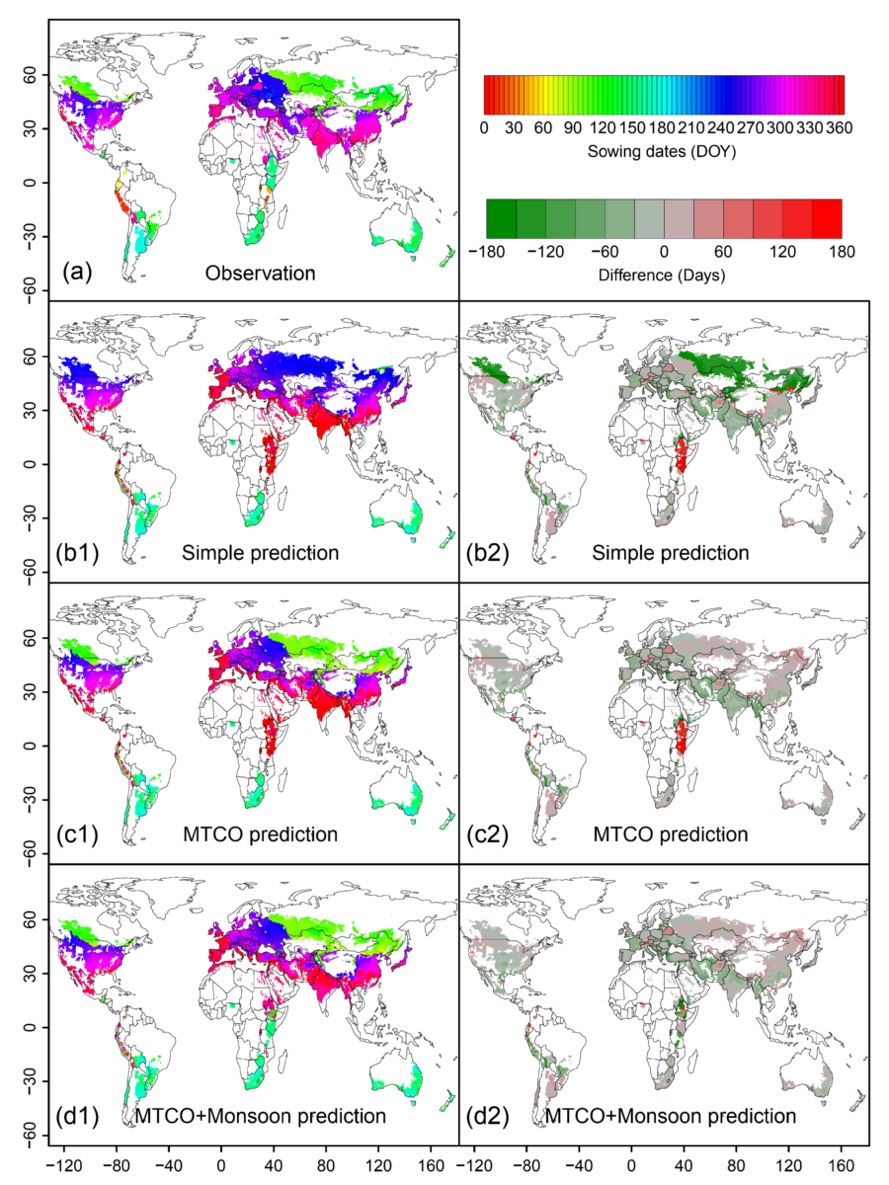 图 1 小麦播种日期的全球分布格局。(a)基于统计数据的全球小麦播种日期的观测;(b1)不考虑额外约束的预测结果;(C1)考虑低温约束的预测结果;(d1)考虑低温和降雨强度的预测结果;(b2-d2)预测结果与观测的差异。