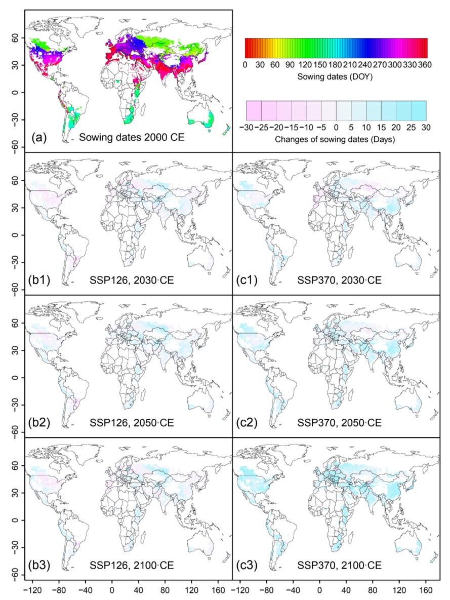 作物模型是研究作物生长响应环境变化的重要工具,被广泛用于作物产量预测和气候风险评估。播种日期是作物模型必不可少的输入变量,直接影响模型结果的准确性。观测资料显示受气候变化的影响,全球作物播种日期在过去几十年中已发生不同程度的变化,调整播种日期也被认为是应对气候变化不利影响最为经济有效的措施。然而,由于缺乏对播种日期变化规律的机理性认识,当前作物模型一般预设固定的播种日期,不考虑其随时间和环境的变化。这样处理虽能反映当下作物播种日期的空间格局,但在对未来产量进行预测时却引入了较大的不确定性,极大地制约了人类科学应对气候变化的能力。