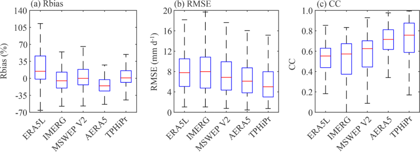图2 基于独立站点数据的TPHiPr验证结果及其与四种主流降水产品的对比。Rbias:相对偏差(%);RMSE:均方根误差(mm d-1);CC:相关系数。