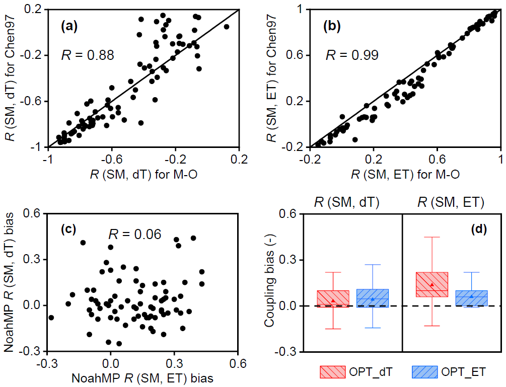 图3 NoahMP模型在两种近地层湍流传输方案(M-O相似理论方案和Chen97方案)下的(a)土壤水含量-蒸散发相关系数比较和(b)土壤水含量-地表温度日较差相关系数比较。(c)基于遥感资料识别的NoahMP模型中以相关系数表示的两种耦合关系偏差间的关系。(d)在两种优化方案下基于遥感资料识别的NoahMP两种耦合关系偏差。