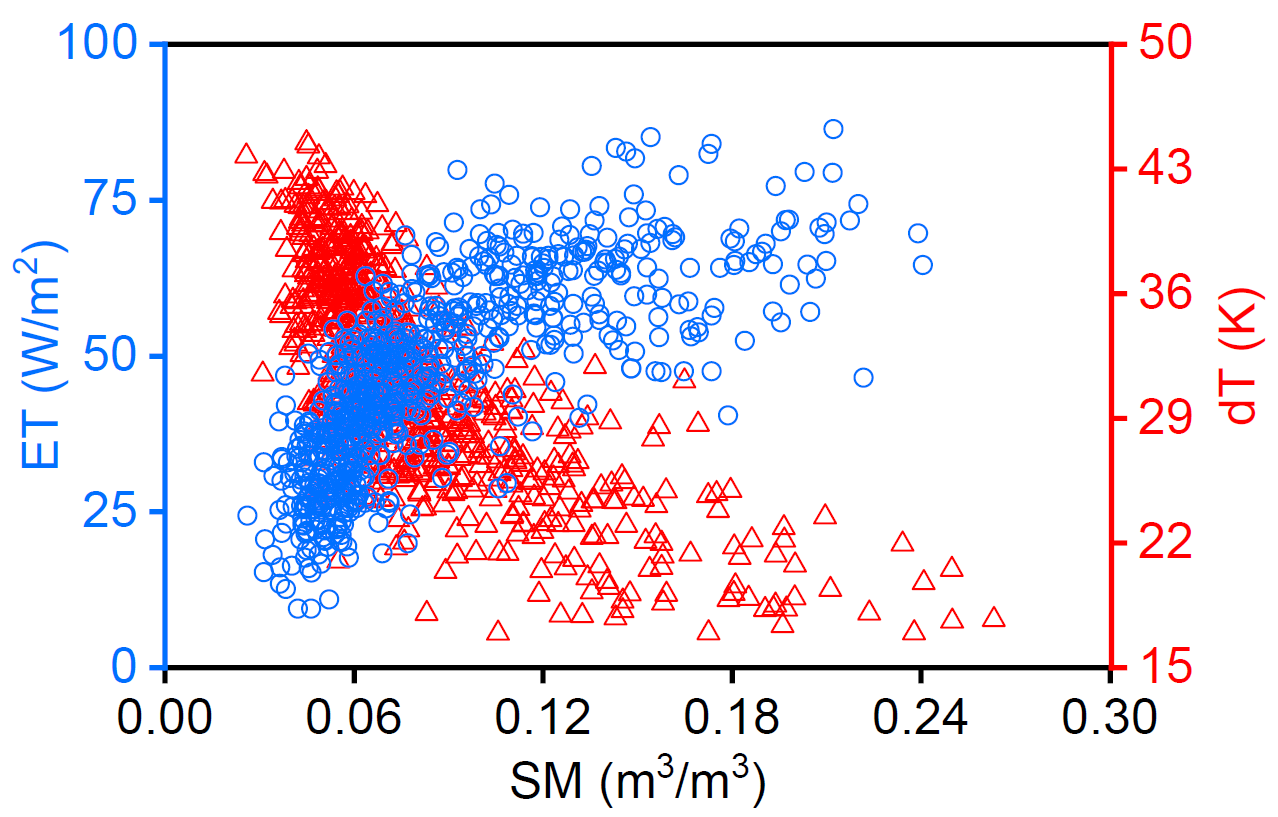 图1 示例格点的遥感蒸散发(ET)和地表温度日较差(dT)随遥感土壤水含量(SM)变化的关系。