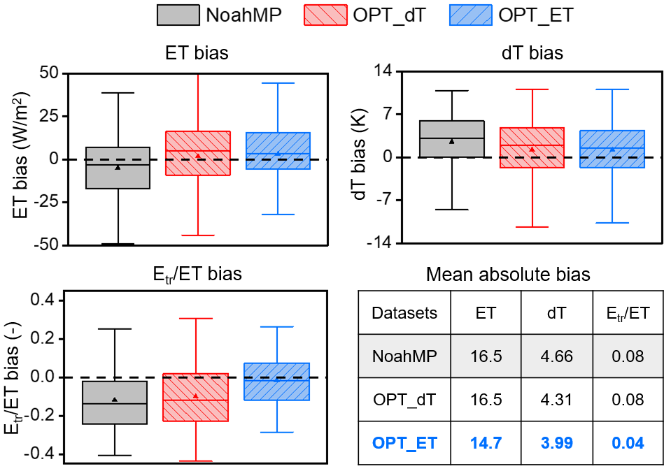 为回答上述问题,清华大学地球系统数值模拟教育部重点实验室(后简称“实验室”)阳坤教授研究组博士后周建宏与合作者设计了两组方案对陆面模型NoahMP的参数进行优化,两组方案的优化目标分别设置为遥感土壤水含量与地表温度日较差的相关系数和遥感土壤水含量与蒸散发的相关系数。结果表明,基于遥感土壤水含量-蒸散发相关系数的参数优化(OPT_ET)不仅可同时提高陆面模型蒸散发和地表温度日较差的模拟精度,还能改进陆面模型中植被蒸腾与蒸散发的比例,而基于遥感土壤水含量-地表温度日较差相关系数的优化(OPT_dT)对它们的模拟改进则不明显(图2)。