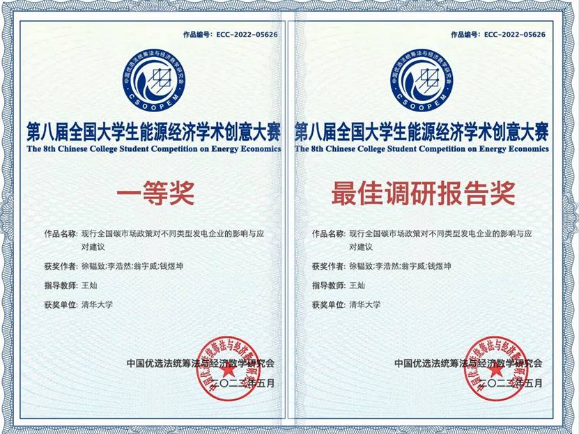 5月14日-15日,中国优选法统筹法与经济数学研究会主办的第八届全国大学生能源经济学术创意大赛决赛在郑州大学举行。清华大学地球系统数值教育部重点实验室2018级博士李浩然、2017级博士生翁宇威、钱煜坤和清华大学环境学院2018级博士生徐韫致共同组成的团队获得一等奖及最佳调研报告奖。