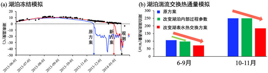 图2 (a)纳木错的观测与模拟的冻结时间对比;(b)湖泊内部过程参数和湖表水热交换方案在不同阶段的湖泊湍流交换热通量变化(根据论文,图片作适当修改)