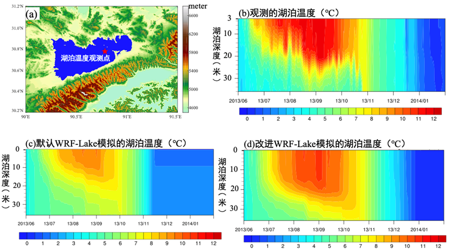 图1 纳木错(a)地理位置,颜色表示高程,红色五角形代表湖泊温度观测位置;(b)观测的湖泊温度的季节变化;(c)默认WRF-Lake模拟的湖泊温度的季节变化;(d)改进WRF-Lake后模拟的湖泊温度的季节变化
