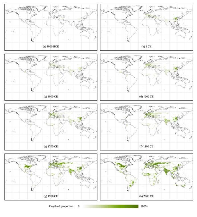2021年11月19日,清华大学地球系统数值模拟教育部重点实验室俞乐课题组在《地球系统科学数据》(Earth System Science Data)上发表题为“A 1 km global cropland dataset from 10 000 BCE to 2100 CE”的论文,发布了首套从公元前10000年到公元后2100年的1km分辨率全球农地分布数据。