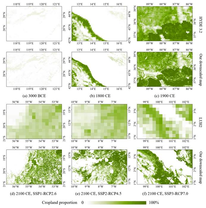 该研究构建了一套普适、灵活、高效的长时序农地分布模拟方法。首先,对历史和未来的农地需求进行同质化处理。随后,基于农地适宜性、核密度、以及其他限制条件,对处理后的农地需求进行空间降尺度,制作了现有最长时序、最高分辨率的全球农地分布数据集。该数据完整刻画和预估了从农业起源到本世纪末的全球农地变化信息(部分数据如图1和2所示),相较于现有的其他长时序农地分布数据,该数据能更好地反映农地分布细节和空间异质性(图3)。本研究的方法框架可以推广到其他地类或特定地区的模拟中,研究的数据成果可以被应用于粮食安全、生物地球化学循环、气候变化、生物多样性等领域的研究和管理中。