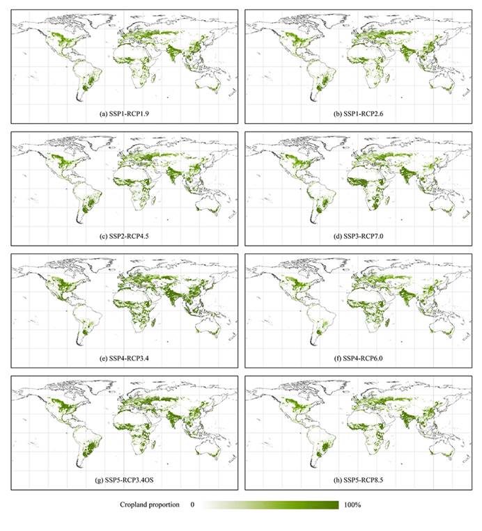 图2 不同未来情景下2100年的全球农地分布图