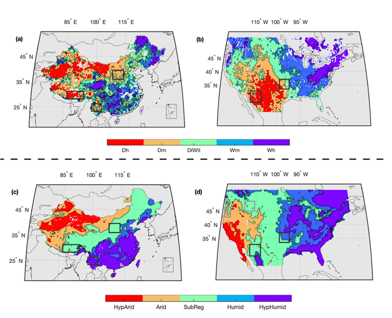 干燥度指数作为衡量一个地区干湿程度的指标,也是全球变化研究中经常涉及的气候指标之一。在传统的计算中,AI指的是多年平均降水量与净辐射之比,但这一计算方法未能充分考虑陆地表面的空间差异特征(例如土壤质地和地形地貌)。为更好地反映这一影响,卢麾课题组发现,利用高时空分辨率遥感数据刻画的蒸散发-土壤水耦合机制可以弥补这一不足。课题组利用自身研发的长时序日尺度地表土壤水分数据集和基于地表通量平衡理论估算的蒸散发方法,分析了中国和美国区域的蒸散发-土壤水耦合强度(∆𝐶𝑜𝑟𝑟),提出了新的地表干燥度分类方案。