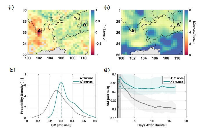 图2位于中国云南的样本A和位于中国湖南的样本A’的蒸散发-土壤水耦合强度(图a)和AI空间分布图(图b),以及二者的土壤水分概率密度曲线(图c)和土壤水退水曲线(图d)示意图。样本A和A’具有相近的降水量,却表现出了相反的蒸散发机制。这可能是由于样本A所在的云贵高原地区分布着较多的喀斯特地貌,到达地表的降水下渗到深层土壤中的速率较快,因此表层的土壤水分含量较为干燥。