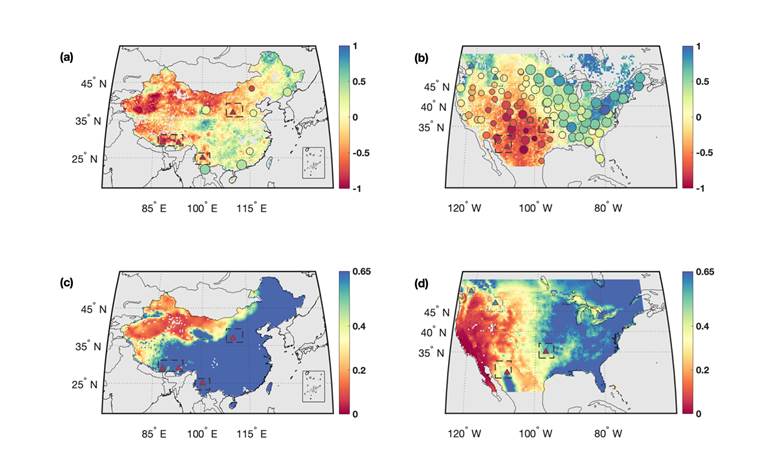 图1 蒸散发-土壤水耦合强度(a-b;∆𝐶𝑜𝑟𝑟>0时代表蒸散发受能量限制,反之受水分控制,同时∆𝐶𝑜𝑟𝑟绝对值越大,蒸散发-土壤水耦合强度越高)和干燥度指数AI(c-d)在两个研究区域的空间分布图。图中字母为研究中选取分析样本的标注。