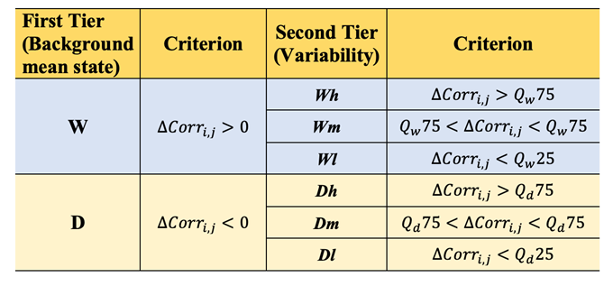 基于以上分析,研究提出了基于蒸散发-土壤水耦合机制的双级地表干燥度划分方案(图3)。其中,一级分类反映的是与AI相同的信息,即由蒸散发的能量/水量限制机制决定的地表湿润(W)和干燥(D)的条件。同时,由于∆𝐶𝑜𝑟𝑟与AI反映的不同信息是由下垫面空间异质性和陆气交互作用引起的,这意味着对蒸散发-土壤水耦合强度进行分类能够对极端天气气候事件具有指示意义。因此,在二级分类中,当耦合强度大于75百分位时,意味着此地区发生极端天气气候事件的风险较高(h),而低于25百分位时则风险较低(l)。
