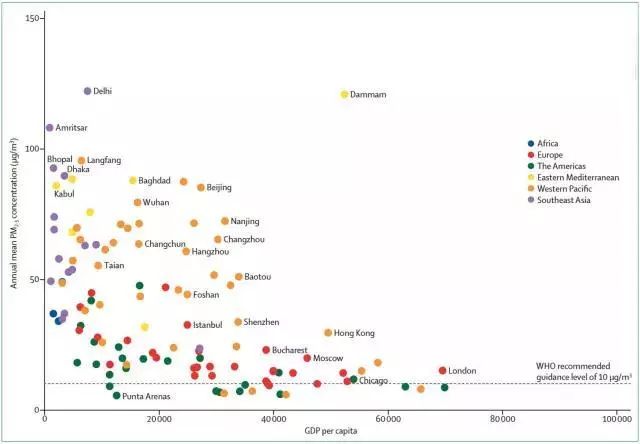我们将世界上246个城市的PM2.5跟人均GDP的关系做了一个图,中国的城市绝大多数处在廓线的低端和外围,说明我们很多都是高污染低人均收入的城市。