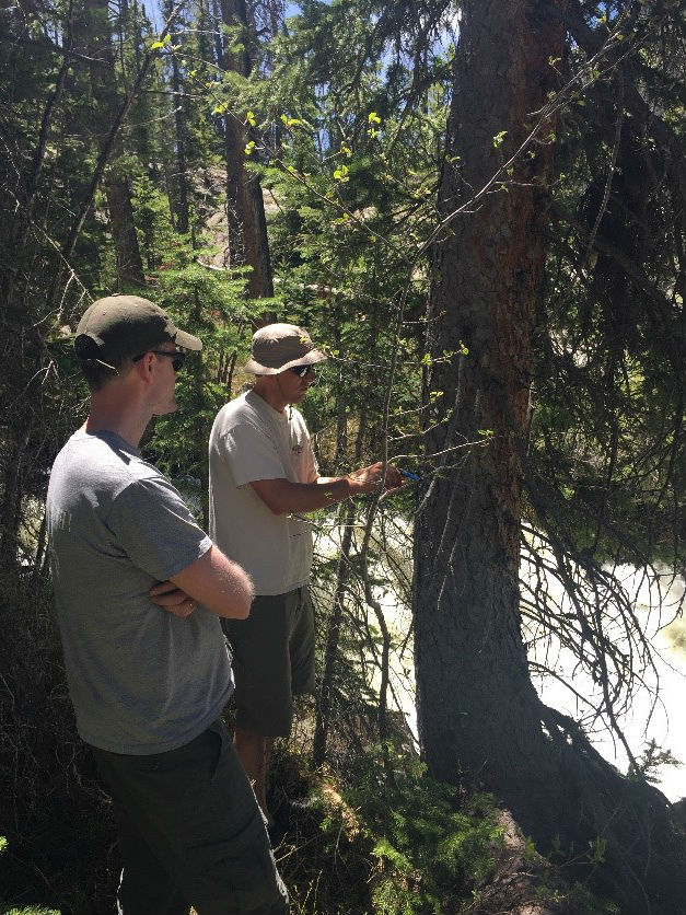 组图为宫鹏教授、李丛丛博士以及美国地质调查局人员一起考察受山甲虫侵害的森林状况