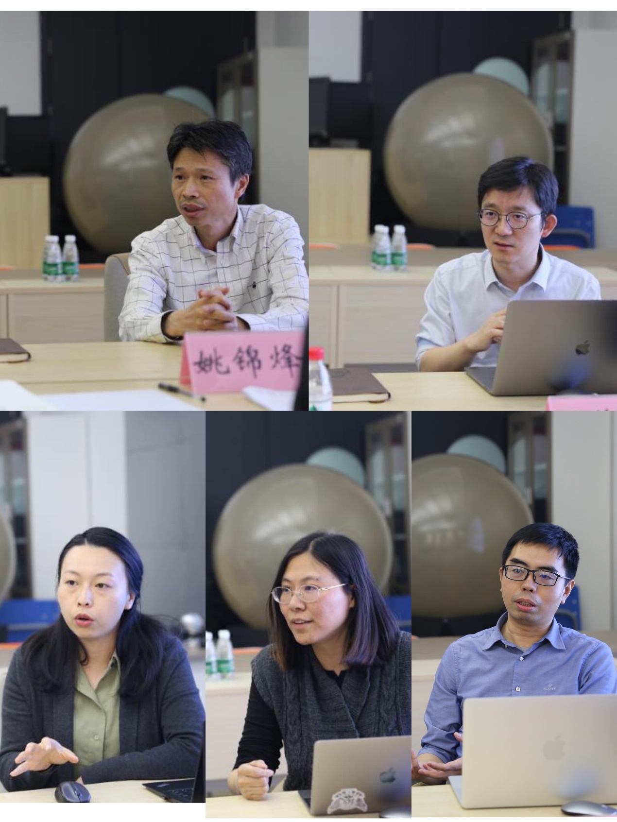 地学系教师代表发言。从上到下,从左至右分别为林岩銮、黄小猛、蔡闻佳、徐芳华和俞乐。