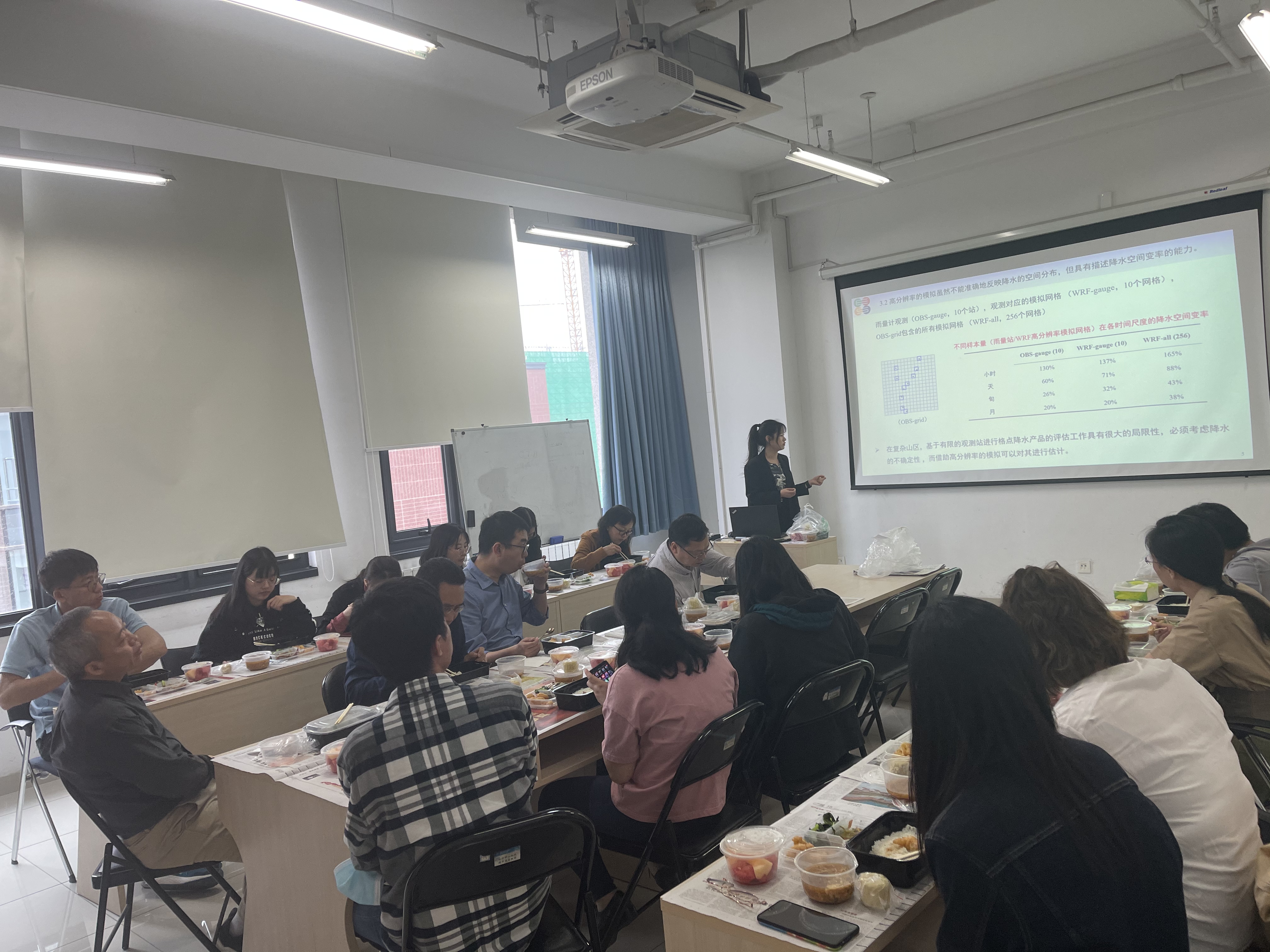 欧阳琳主要分享了如何在有限地面观测资料的支持下,利用高分辨率的数值模拟估计网格尺度内降水的空间变率和能代表区域平均降水最少站点数的方法。参会教师围绕量化方法应用问题进行了积极地讨论,提出后续可以探索不同地形条件(如坡向、坡面等)对降水空间变率的影响,以及雨量计观测的系统误差、仪器误差等建议。