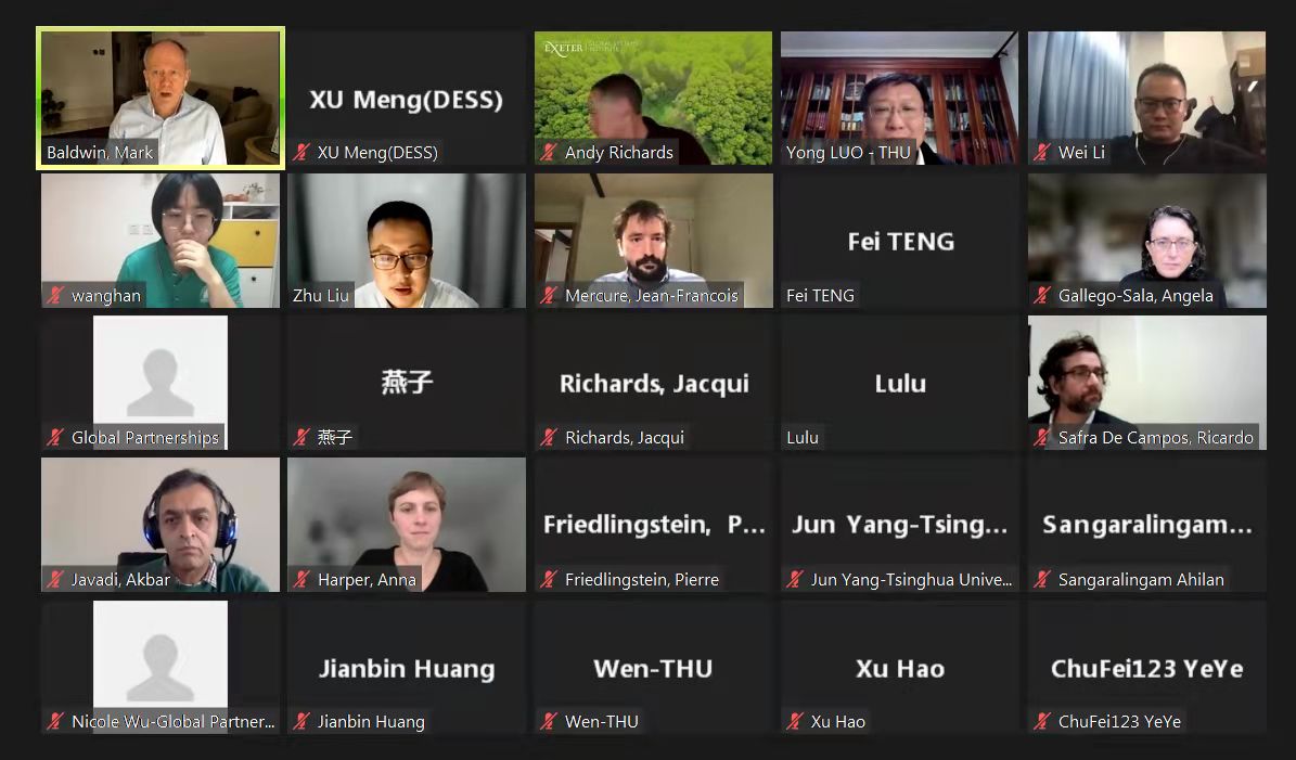 2021年11月16日,清华大学地学系和英国埃克塞特大学全球系统研究所联合举办的“碳中和主题研讨会”在线举行。会议由地学系主任罗勇教授和埃克塞特大学全球系统研究所院长助理Mark Baldwin教授主持。地学系杨军教授、王焓、刘竹、李伟副教授,清华大学能源环境经济研究所副所长、腾飞副教授,埃克塞特大学全球系统研究所高级讲师Anna Harper、讲师Ricardo Safra de Campos,教授Gallego-Sala Angela,高级讲师Jean-Francois Mercure参加了本次会议。在线参会人数达44人。