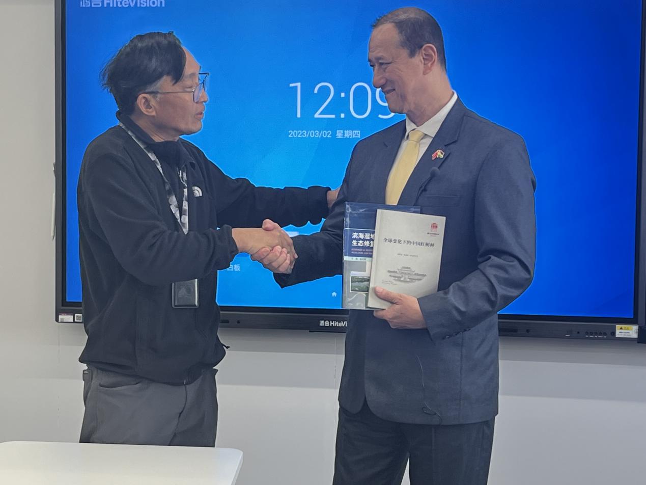 最后,林光辉教授赠予王纯万大使《全球变化的中国红树林》和《滨海湿地生态修复技术及其应用》书籍。