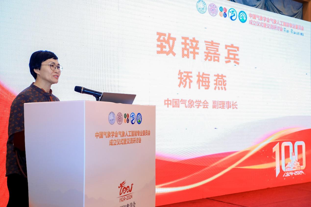 中国气象学会副理事长矫梅燕致辞,对专委会的成立表示祝贺,并对专委会的未来发展提出了期望。她希望专委会充分发挥气象业务与人工智能之间的纽带作用,推动人工智能在气象领域的应用和创新;建立起一个学术交流和科技创新的平台,鼓励广泛的交流合作,促进学科交叉融合;并注重对青年人才的培养,为这一领域的发展注入新的活力。